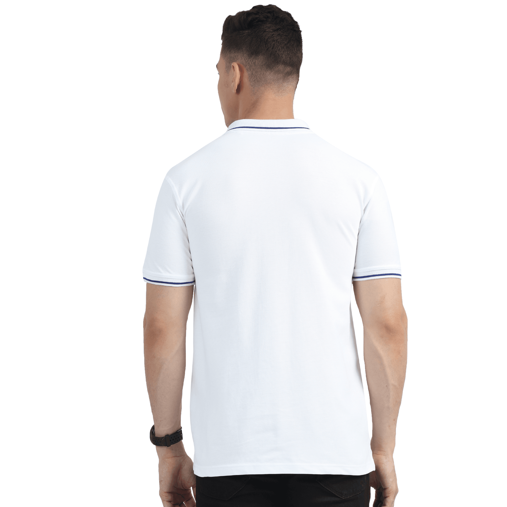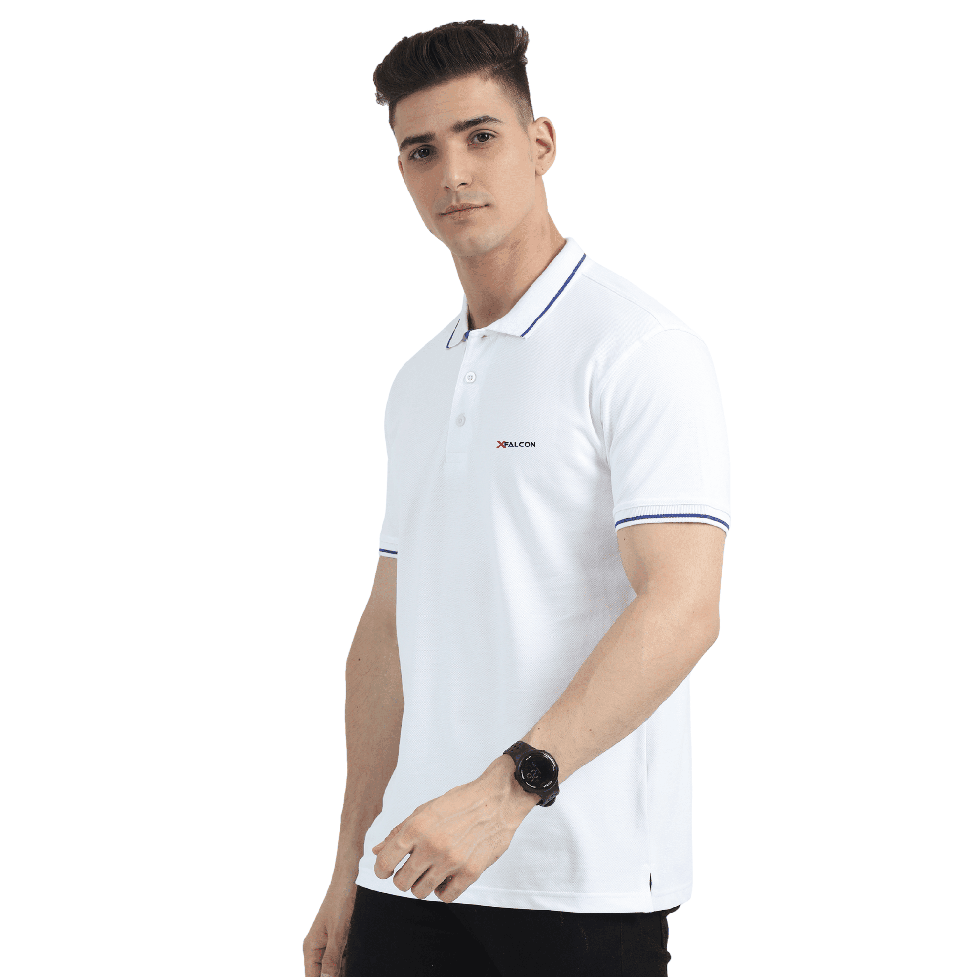 XFALCON White Organic Polo T-Shirt with Blue Tipping, crafted with 100% premium bio washed cotton for unbeatable softness, durability, and breathability. Featuring a refined 270 GSM fabric, this polo ensures long-lasting structure and comfort. The deep White color adds timeless style, while the contrast tipping on the collar and placket, along with velvet tape accents, gives it a bold, elevated look. Side slits provide ease of movement, making it ideal for both active and casual all-day wear. Manufactured in a sustainable green facility, this eco-friendly polo is the perfect blend of style, comfort, and responsibility.
